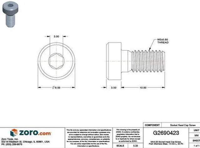 California Proposition 65: This product contains a chemical known to the State of California to cause birth defects or other reproductive harm. Socket Head Cap Screw, Head Type Low-Profile Standard, System of Measurement Metric, Drive Type Socket, Drive Size 3 mm, Material Stainless Steel, Material Grade/Class 18-8, Finish Plain, Thread Size M5x 0.80, Minimum Thread Length 10 mm, Fastener Length 10 mm, Head Height 3.5 mm, Head Diameter 8.5 mm, Pack Size Small Pack, Thread Style Fully Threaded, Special Features Not Applicable, Countersink Angle Not Applicable, Dimensional Standards DIN 7984, Flange Diameter Not Applicable. This item has been restricted from sale in the following state (s): []