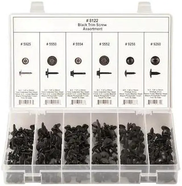 Screw Assortment, Finish Black Finish, Head Type Hex, Drive External Hex, Phillips, Number of Sizes 6, Number of Pieces 210, Material Steel, Pack Size Small, System of Measurement Metric, Dimensional Standards Not Applicable, Thread Type Not Applicable, Container Length 11 in, Container Material Plastic, Container Width 6 3/4 in, Head Style Hex, Hex Head Screws Included (4) 4.2 - 1.41 x 20 mm, 4.8 - 1.60 x 15 mm, 6.3 - 1.81 x 16 mm. This item has been restricted from sale in the following state (s): []