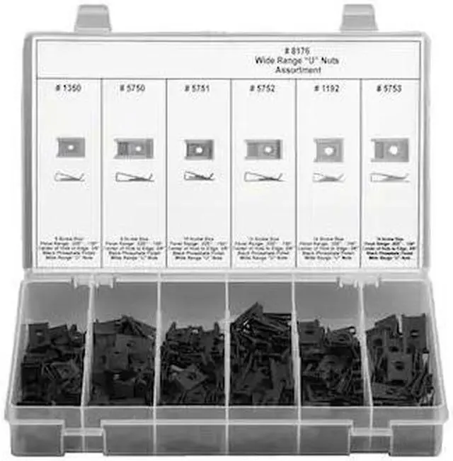 U Nut Assortment, Dimensional Standards Not Applicable, Hex Type Not Applicable, Includes Washers No, Material Grade/Class Grade 5, Number of Nuts 210, Number of Thread Sizes 6, Number of Washers 0, Nut Finish Phosphate, Nut Type U Nut, Smallest Thread Size #8-32, System of Measurement Inch, Thread Sizes #10, #8, 1/4 In.. This item has been restricted from sale in the following state (s): []