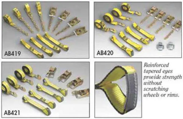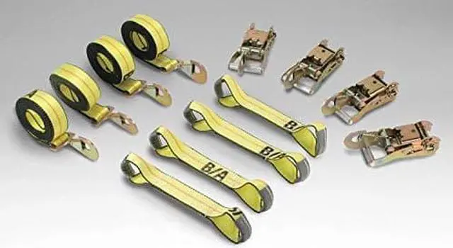 Tie Down Strap, Cargo Tie Down Adjustment Ratchet, Cargo Tie Down Length 14 ft, Cargo Tie Down Width 2 in, Working Load Limit 2, 000 lb, Breaking Strength 6, 600 lb, Cargo Tie Down Material Polyester, Cargo Tie Down End Material Steel, Color Yellow, Cargo Tie Down End Type Snap Hook, For Use With Roll backs and trailers, Includes 4 Long Straps, 4 Ratchets, 4 Short Straps, Standards WSTDA-T-1. This item has been restricted from sale in the following state (s): []