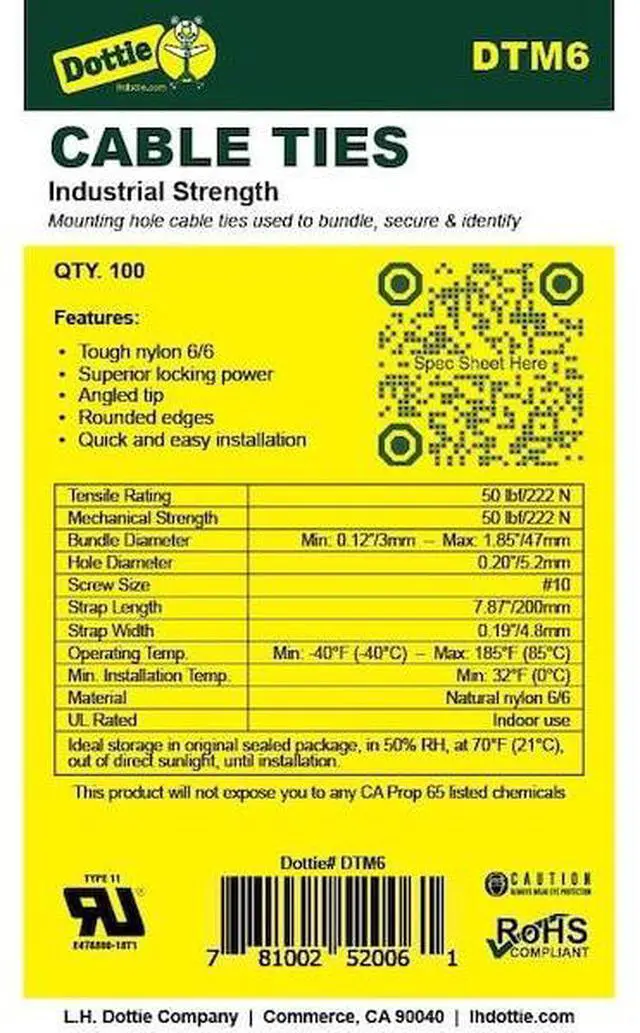 DOTTIE DTM6 Cable Tie, 8 in L, 1.85 in Max Bundle Dia., Natural, Nylon 6/6, 50