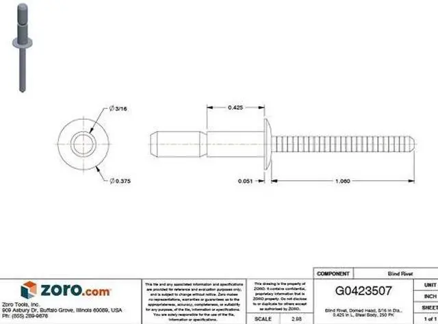 Blind Rivet, 1 53/73 In. L, 0.183 In. dia, PK250, System of Measurement Inch, Overall Length 1 23/32 in, Body Length 27/64 in, Shank Diameter 0.183 in, Product Type Blind Rivet, Body Material Steel, Finish Zinc Plated, Head Type Dome, Head Diameter 3/8 in, Head Angle Not Applicable, Shear Strength 590 lb, Tensile Strength 815 lb, Maximum Hole Diameter 0.196 in, Minimum Material Thickness 1/8 in, Maximum Material Thickness 1/4 in, Material Grade/Class IFI-114-30, Mandrel Material Steel.