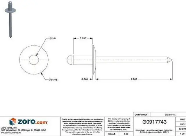 Blind Rivet, 1.54 in L, 0.122 in dia, PK500, System of Measurement Inch, Overall Length 1 35/64 in, Body Length 1/4 in, Shank Diameter 0.122 in, Product Type Blind Rivet, Body Material Aluminum, Finish Plain, Head Type Flanged, Head Diameter 3/8 in, Head Angle Not Applicable, Shear Strength 155 lb, Tensile Strength 235 lb, Maximum Hole Diameter 0.133 in, Minimum Material Thickness 1/16 in, Maximum Material Thickness 1/8 in, Material Grade/Class IFI-114-11, Mandrel Material Aluminum. This item has been restricted from sale in the following state (s): []
