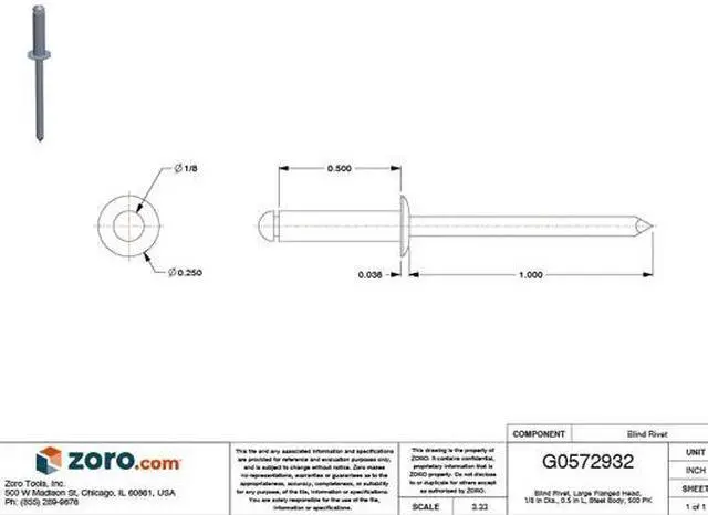 Blind Rivet, 1 59/99 In. L, 0.122 In. dia, PK500, System of Measurement Inch, Overall Length 1 19/32 in, Body Length 1/2 in, Shank Diameter 0.122 in, Product Type Blind Rivet, Body Material Steel, Finish Zinc Plated, Head Type Flanged, Head Diameter 1/4 in, Head Angle Not Applicable, Shear Strength 295 lb, Tensile Strength 425 lb, Maximum Hole Diameter 0.133 in, Minimum Material Thickness 5/16 in, Maximum Material Thickness 3/8 in, Material Grade/Class IFI-114-30, Mandrel Material Steel.