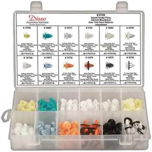 Import Door Trim Panel Assortment, Number of Pieces 170, Number of Sizes 12, Product Type Push-In Rivet Assortment, Material Grade/Class Ungraded, Manufacturer Location Made in USA*, Made in North America Yes. This item has been restricted from sale in the following state (s): []
