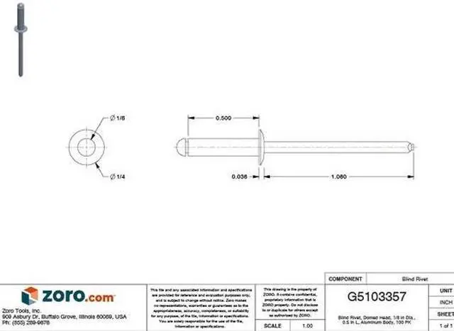 Blind Rivet, 1/8 in dia, PK100, System of Measurement Inch, Body Length 1/2 in, Shank Diameter 0.125 in, Product Type Blind Rivet, Body Material Aluminum, Head Type Dome, Head Diameter 1/4 in, Maximum Hole Diameter 0.125 in, Minimum Material Thickness 3/16 in, Maximum Material Thickness 1/4 in, Material Grade/Class IFI-114-11, Mandrel Material Aluminum, Color Black, Manufacturer Location Globally Sourced, Package Quantity 100. This item has been restricted from sale in the following state (s): []