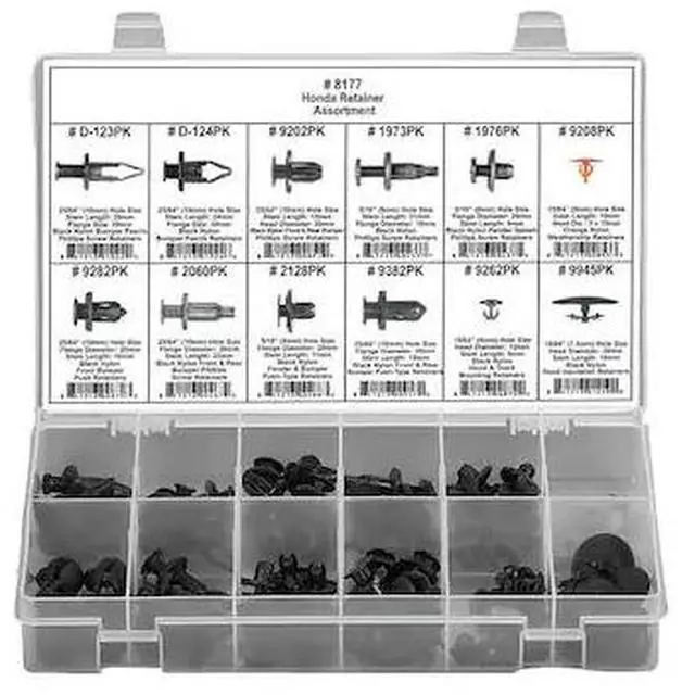 Honda Retaier Assortment, Number of Pieces 121, Number of Sizes 12, Product Type Push-In Rivet Assortment, Material Grade/Class Ungraded, Manufacturer Location Globally Sourced, Made in North America No
