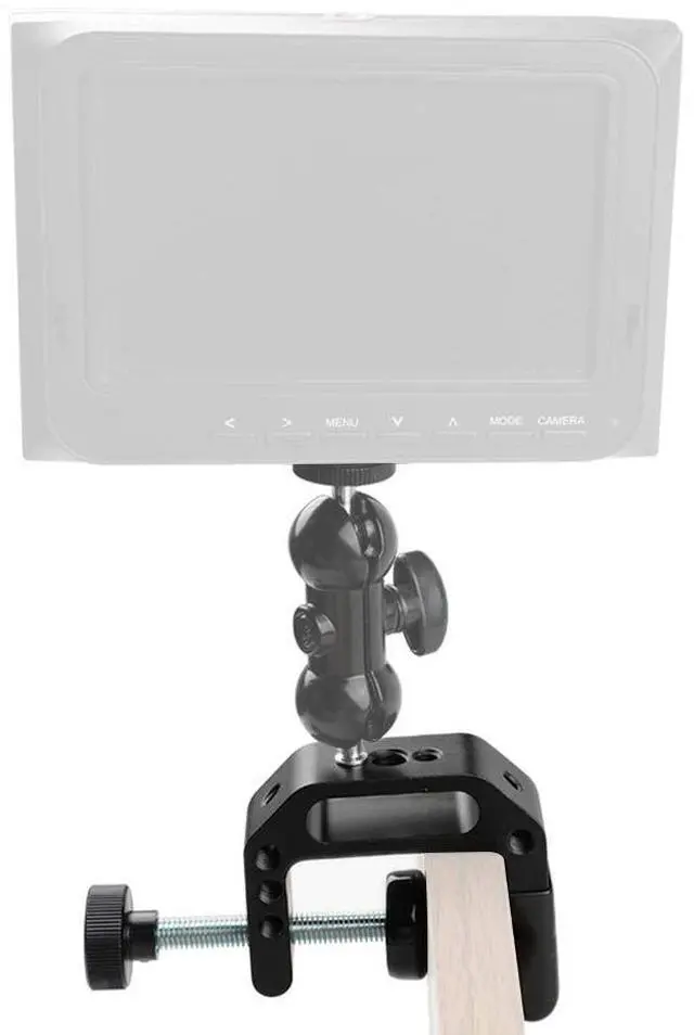 It provides 8 1/4"-20 thread holes and one 3/8"-16 thread hole;Attaches easily to desks, carts, benches, worktables, posts, etc.The C-clamp jaws expand from 3mm to 42mm wide.