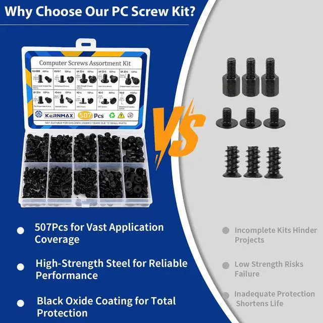 507-Piece PC Screw KitThis Kernmax all-inclusive computer screws kit contains essential hardware like motherboard screws, standoffs screws, SSD mounting screws, Hard Drive Screws, PC case screws, PC fan screws, and CD-ROM Screws the ideal solution for all PC building and repair tasks.