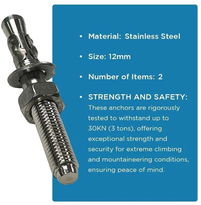 The Dynamo Expansion Bolt is a stainless steel wedge-type anchor ideal for medium to high hardness rocks like sandstone. With a 12mm diameter and 95mm recommended bore length, it offers robust outdoor durability, though its not marine grade. Ensure compatibility with base rock strength; avoid soft rocks like limestone. Not suited for coastal areas; contact us for custom marine-grade options. Tested to meet EN 959:2007 standards, this bolt ensures a minimum breaking strength of 25kN, providing reliable and secure anchorage for your projects.