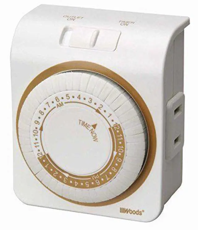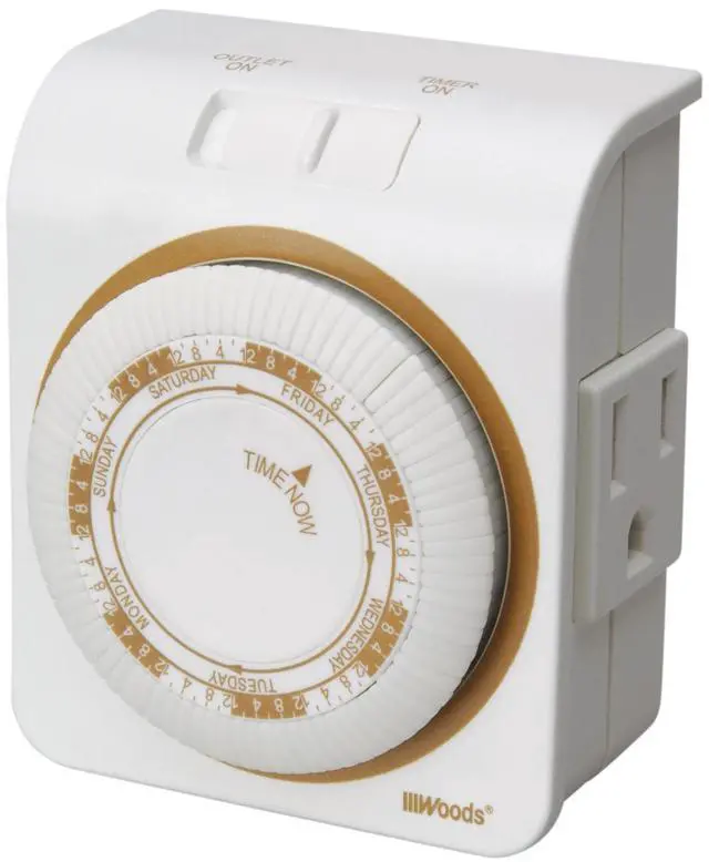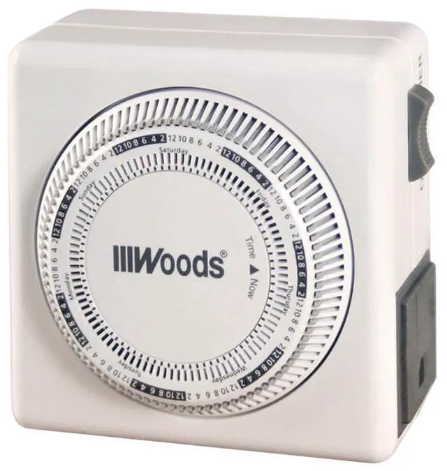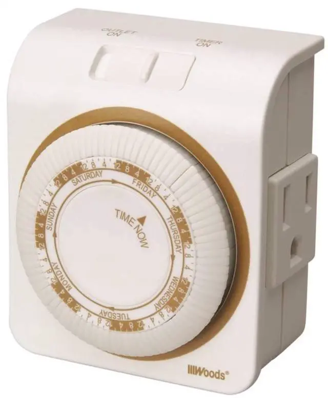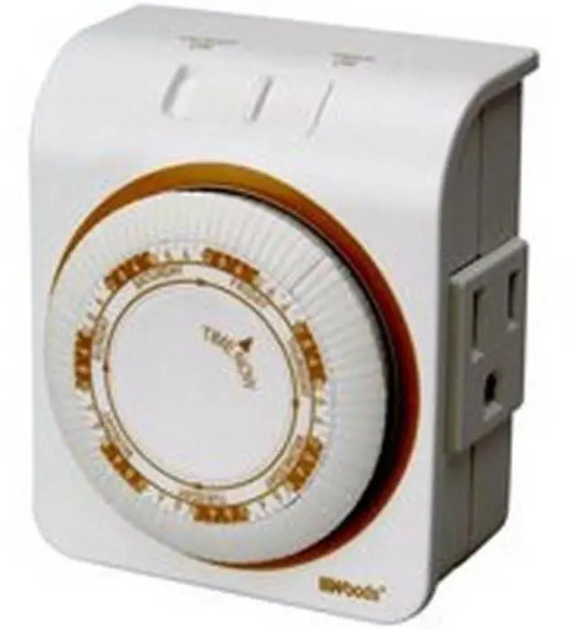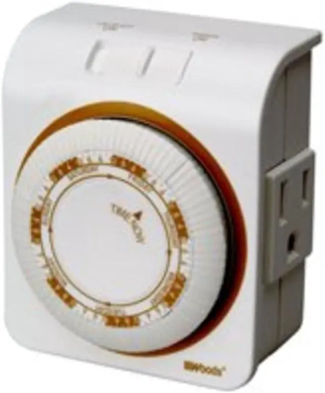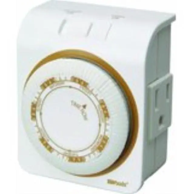 Automates lamps fans and other 3-prong appliances. Up to 6 on/off settings per day repeats weekly. Programmable in 2 hour intervals. 3-conductor outlet and plug. Pins cannot be removed or lost. Instruction slot and manual override switch. CSA CertifiedC/US CFL compatible. White with taupe silkscreen. 2.5" depth x 5" width x 6.25" height .24 pounds 15 amp (1875 watts) resistive / 8 amp 1000 watts tungsten / 5 amp ballast 125 volt 60 Hz. With 3-conductor outlet and plug.null