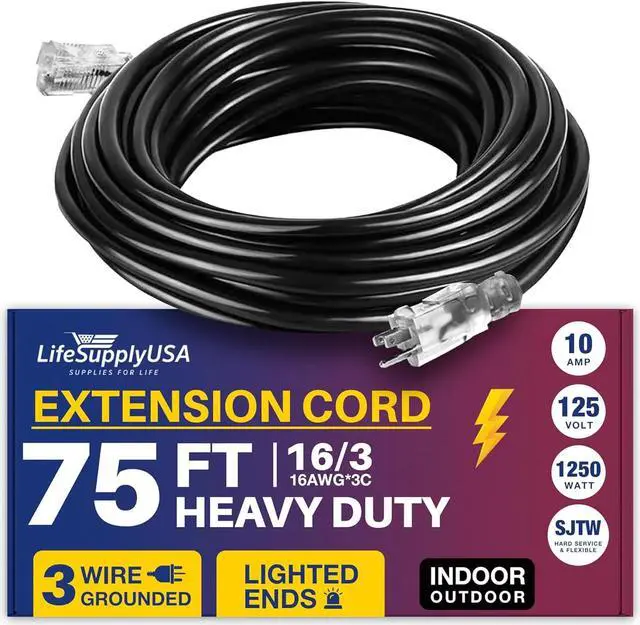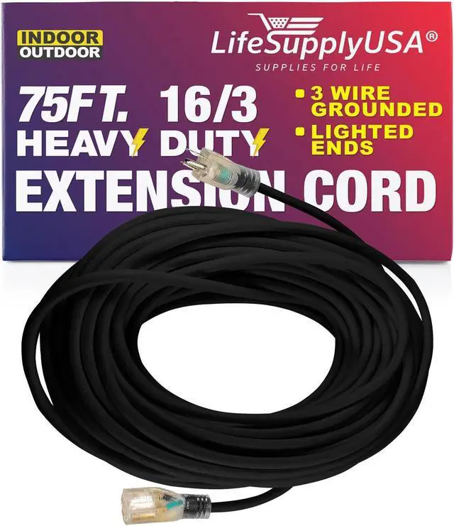 • 16/3 75ft SJTW 13 Amp 125 Volt 1625 Watt Lighted End Indoor / Outdoor Black Heavy Duty Extension Cord (75 Feet)