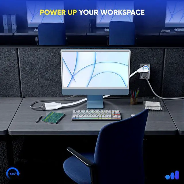 Maximm 360° Rotating Flat Plug Extension Cord/Wire The rotating extension cords are unique for their sleek and adaptable design. They are versatile due to its rotating plug providing angular flexibility to a full 360 degrees, the prongs rotate in the plug so you can aim the cord in any direction you wish without blocking the other outlets. Clutter ControlMaximm Solves those power problems with ease using the Flat Plug Rotating Extension Cord. It has a space-saving design to eliminate bulky or awkward cords. Since it hugs the wall nicely and extends only a half an inch from the wall bending to a 90-degree angle - so it doesn't poke into adjacent objects - you can place your desk, couch, bookshelf etc, right up against the wall freeing up some space.