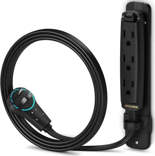 Maximm 360° Rotating Flat Plug Extension Cord/Wire The rotating extension cords are unique for their sleek and adaptable design. They are versatile due to its rotating plug providing angular flexibility to a full 360 degrees, the prongs rotate in the plug so you can aim the cord in any direction you wish without blocking the other outlets. Clutter ControlMaximm Solves those power problems with ease using the Flat Plug Rotating Extension Cord. It has a space-saving design to eliminate bulky or awkward cords. Since it hugs the wall nicely and extends only a half an inch from the wall bending to a 90-degree angle - so it doesn't poke into adjacent objects - you can place your desk, couch, bookshelf etc, right up against the wall freeing up some space.