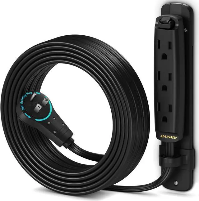 Maximm 360° Rotating Flat Plug Extension Cord/Wire The rotating extension cords are unique for their sleek and adaptable design. They are versatile due to its rotating plug providing angular flexibility to a full 360 degrees, the prongs rotate in the plug so you can aim the cord in any direction you wish without blocking the other outlets. Clutter ControlMaximm Solves those power problems with ease using the Flat Plug Rotating Extension Cord. It has a space-saving design to eliminate bulky or awkward cords. Since it hugs the wall nicely and extends only a half an inch from the wall bending to a 90-degree angle - so it doesn't poke into adjacent objects - you can place your desk, couch, bookshelf etc, right up against the wall freeing up some space.