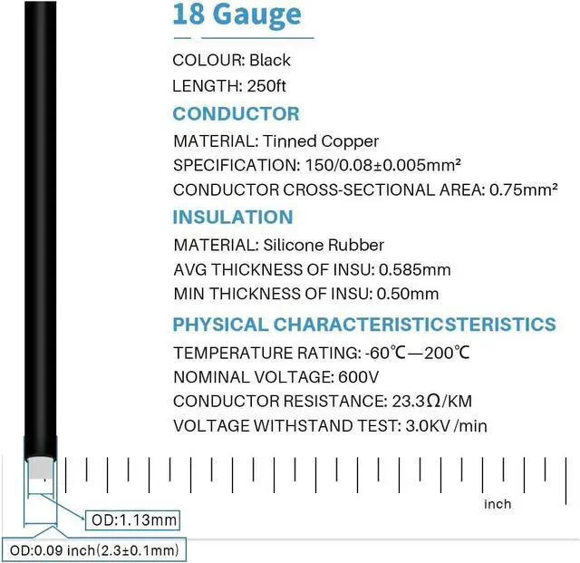 High strand count copper core, 18 AWG silicone stranded wire has 150 strands 0.08 mm tinned copper wire, the copper strands are tinned, protecting them from corrosion and making it easier to solder.