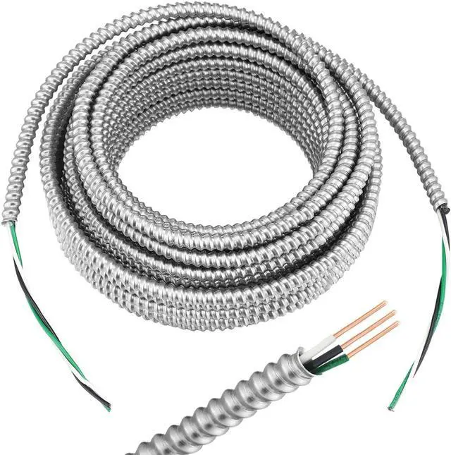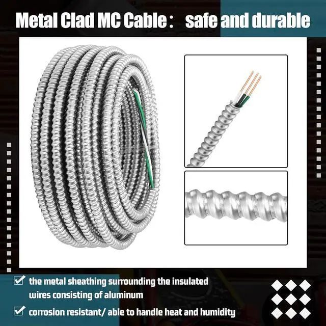 Metal Cable: 100 ft 14/2 metal clad cable contain three solid cooper wires, two are conductor wires and one is a ground wire, the metal sheathing surrounding the insulated wires consisting of aluminum, this 14/2 electrical wire sheath covers the wires in an interlocking configuration to allow for flexibility and coverage