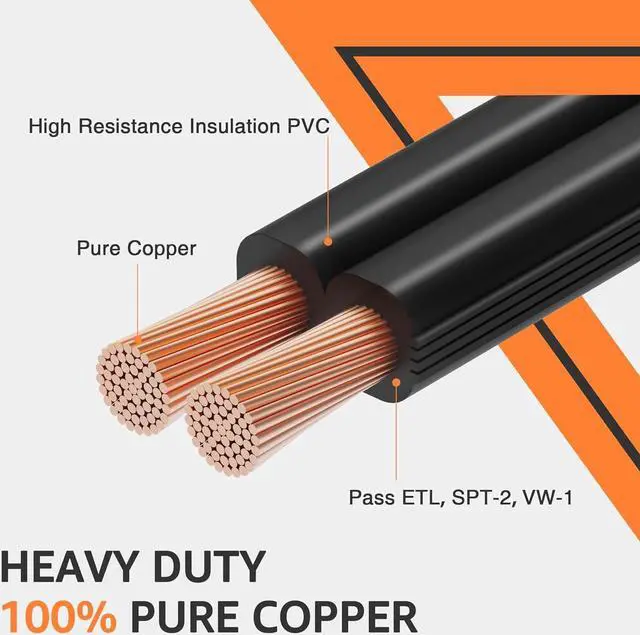 Specification 100FT 14/2 Conductors, SPT-2 black PVC insulation, pure copper, VW-1 fire resistant, maximum working volt 300V. Great for low voltage use.
