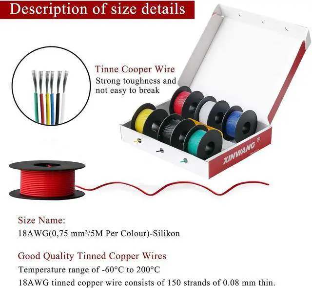 and thick silicone insulation: real copper (tinned) conductor. 18AWG 0.75 mm² 6 colors5 meters per piece tinned copper wire is composed of 150 strands of 0.08 mm thick, twisted together, making it very flexible. Silicone insulation is widetemperature range from -60°C to 200°C), has extremely high strength and effectively prevents short circuits or interruptions