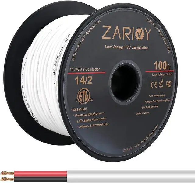 Gauge wire: 14/2 cable rated CL2 for in-wall use, complies with fire safety for use inside the walls. This 14 gauge cable comes wrapped around a hard plastic spool that makes dispensing convenient. Each color is 100FT, easy cut, it' s easy to strip and cut into any length based on needs.