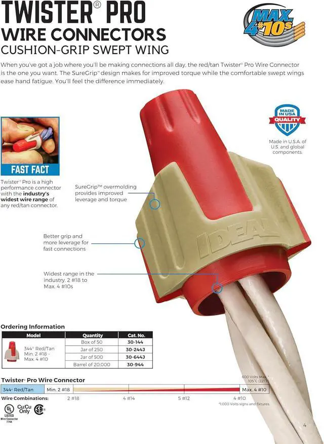 : Wire range 2 # 18 AWG to 4 #10 AWG wires, Tough UL 94V-2 flame retardant shell rated at 105 degree C (221 degree F), 600 V Rated