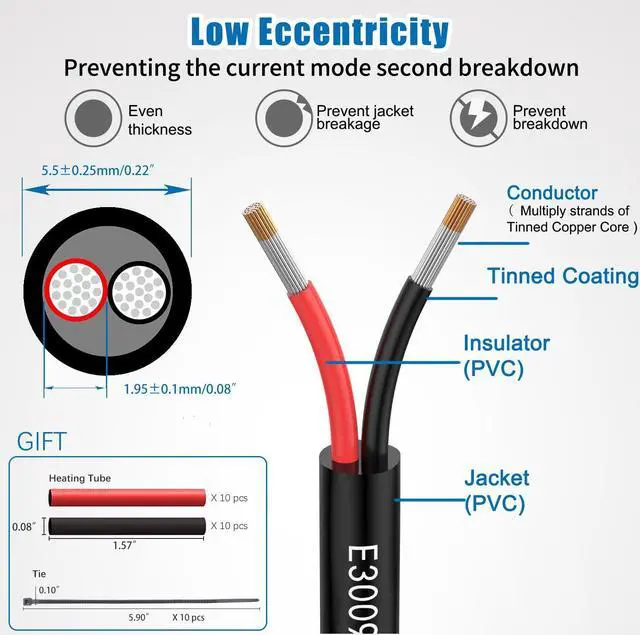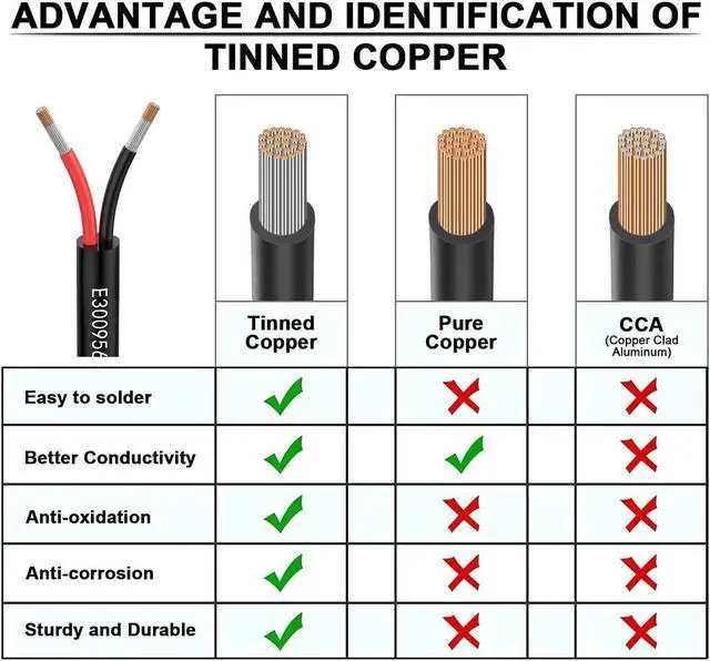 41 strands of 0.16 mm Tinned copper wire are inside each cable - Highly efficient - Super low impedance for a highly efficient connection, the copper strands are tinned, protecting them from corrosion and making it easier to solder, suitable for low voltage outdoor uses such as accent lights, path lights, spotlights, garden accessories, outdoor speaker.