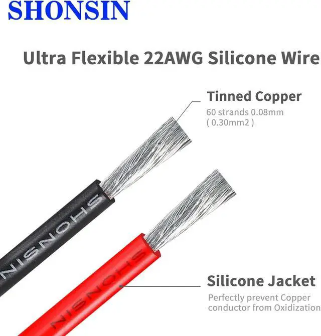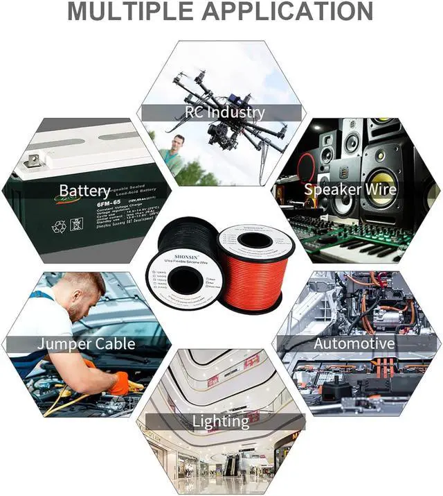 Widely UseSHONSIN 22 gauge electrical wire are widely used for RC Battery, DIY Hobby, electric heating appliances, model cars/planes/ships, lamps, household appliances, meters, instruments etc.