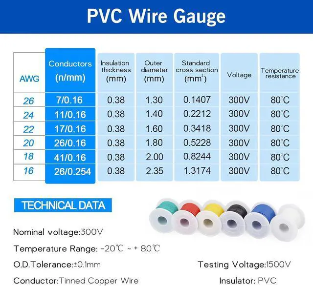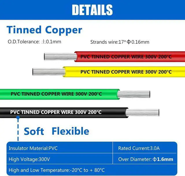 Thick PVC Insulation: Great wires, true copper conductor (tin plated). 22AWG tinned copper wire are consist of 17 strands of 0.16 mm tiny lines which twined together, which makes it very flexible. PVC insulation is greattemperature range is 0°C to 80°C, which has extremely high toughness, is not easy to break, and effectively prevents short circuits or open circuits. does not burn or shrink when touched by soldering iron