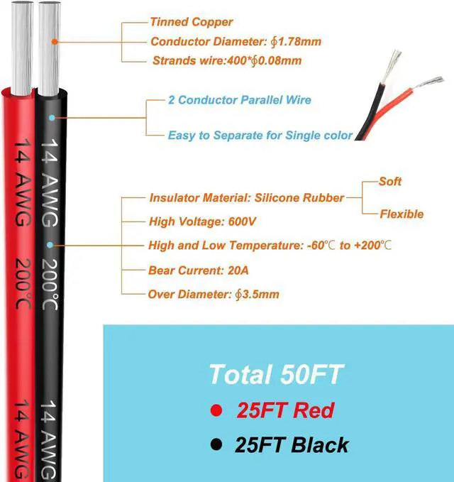 Bear Current: 20A; 14 Gauge silicone wire - super flexible 400 strands of 0.08 mm Tinned copper wire - Highly efficient - Super low impedance for a highly efficient connection.