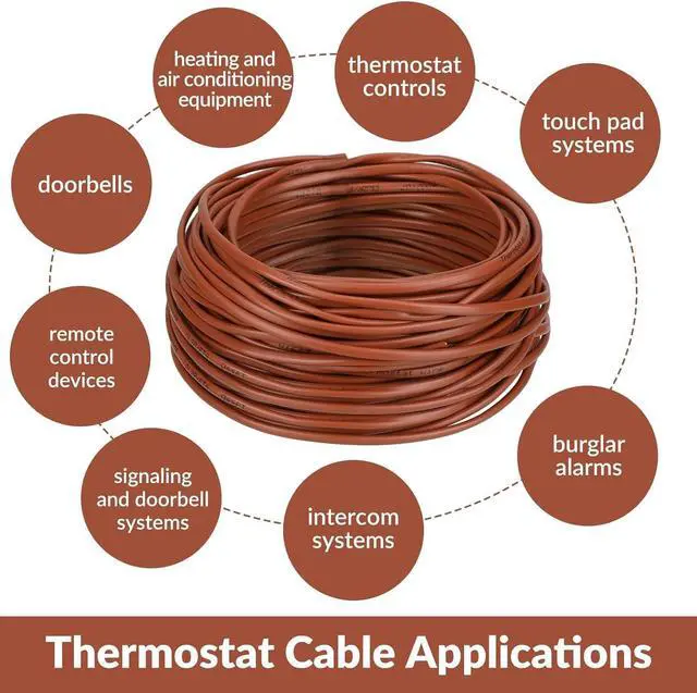 Thermostat Cable Applications: wiring for thermostat controls, heating and air conditioning equipment, doorbells, touch pad systems, burglar alarms, intercom systems, signaling and doorbell systems, remote control devices, signaling systems and other low voltage applications