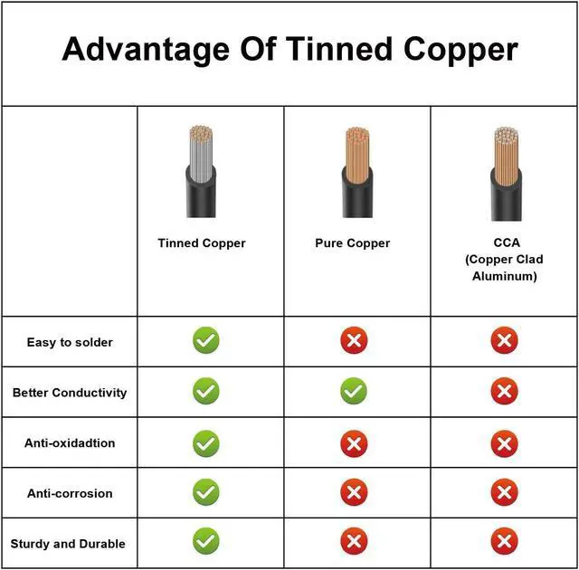 High ConductivityTinned copper not only has good electrical conductivity, but the tin coating also has the characteristics of strong corrosion resistance and oxidation resistance. It can greatly extend the service life comparing with ordinary copper wire. It is also more suitable for soldering.