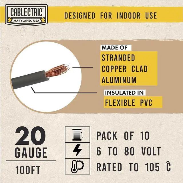 COPPER CLAD ALUMINUM: The most cost-effective alternative for selecting power wire is our 20 gauge cable' s wire, which is also an excellent power conductor. It is made of Aluminum with copper coating.