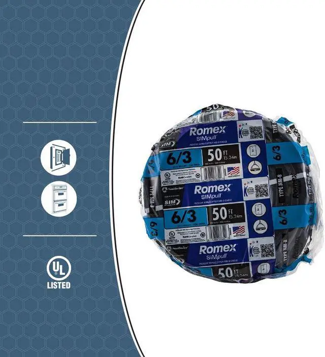 SPECIFICATIONS: Made in America; 6 gauge; 3 conductors with ground; 50' per coilUL Listed type NM-B