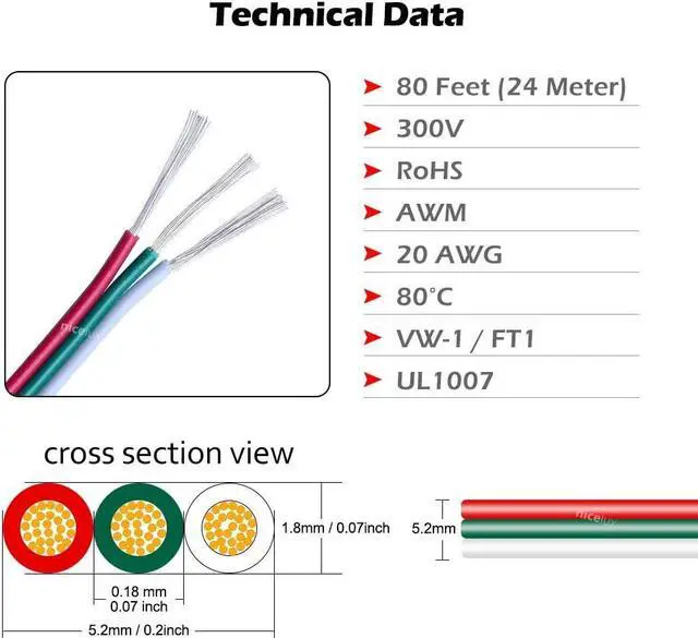 TECHNICAL DATA -80 feet / 24 Meter, AWM 20 AWG 80°C VW-1 300V FTI, Flexible Multi Stranded, Red-Green-White PVC Insulation, Tin Plated Copper, 21* 0.178 TS or 26* 0.16TS (strand)