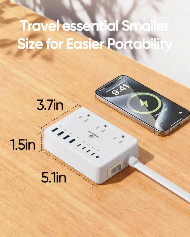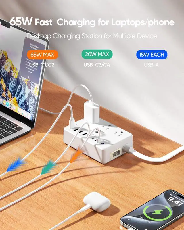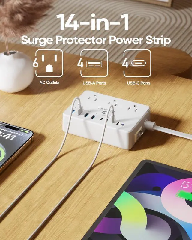 14-in-1 Power Strip with USB Ports: Equipped with 6 AC outlets, 4 USB-C ports and 4 USB-A ports, 14 charging ports can be used simultaneously, providing everything you need to power all your appliances
