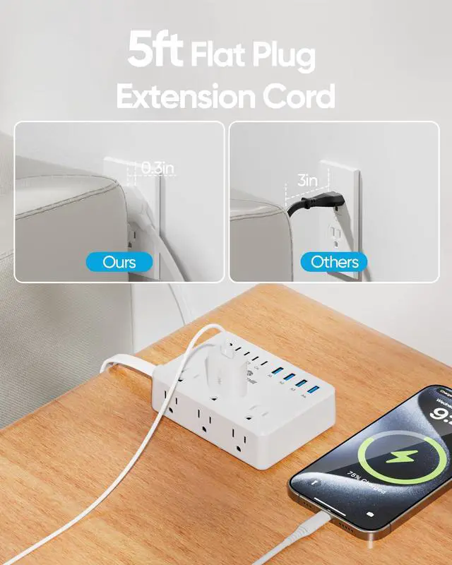 Flat Plug Extension Cord: Featuring flat plug and 5ft extension cord, it can be easily hidden behind furniture (sofa, bed or bedside table). 45 degree plug design does not block other sockets, making it very convenient and space-saving