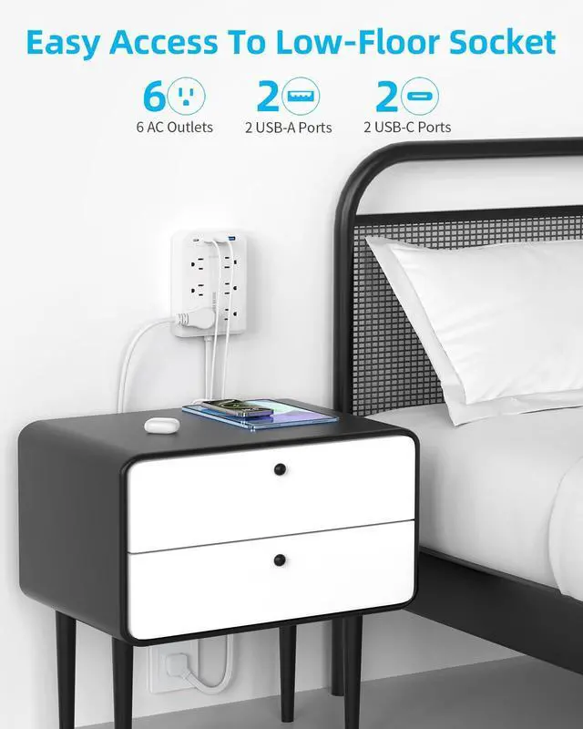 With 6 outlets, 2 USB-A ports and 2 USB-C ports, this flat plug power strip handles up to 10 devices simultaneously.