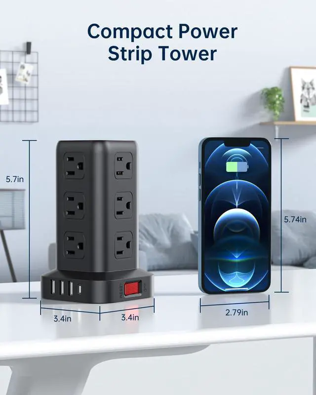 • Power Strip Surge Protector: Built-in circuit breaker with reset/off switch for overload protection of all outlets. The surge protector tower uses ceramic SPD to automatically and quickly cut off the power when a voltage surge is detected, like that caused by lightning, and the 1800 joule protection level ensures the safety of your electronic products and electrical equipment.