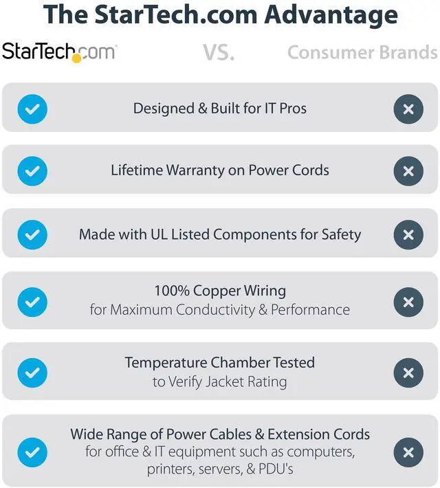 Made with 100% copper wire, StarTech.com power cables are fully compliant with regional industry standards: