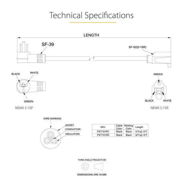 • SPECS: 1ft (0.3m) AC Power Cord | NEMA 5-15R to Right-Angle NEMA 5-15P | 16AWG | 125V 13A (Max) | Jacket Type: SJT | Jacket Material: PVC | Black | Temperature Range: 37°F to 140°F (3°C to 60°C) | Cable Outer Diameter: 0.33in (8.5mm)