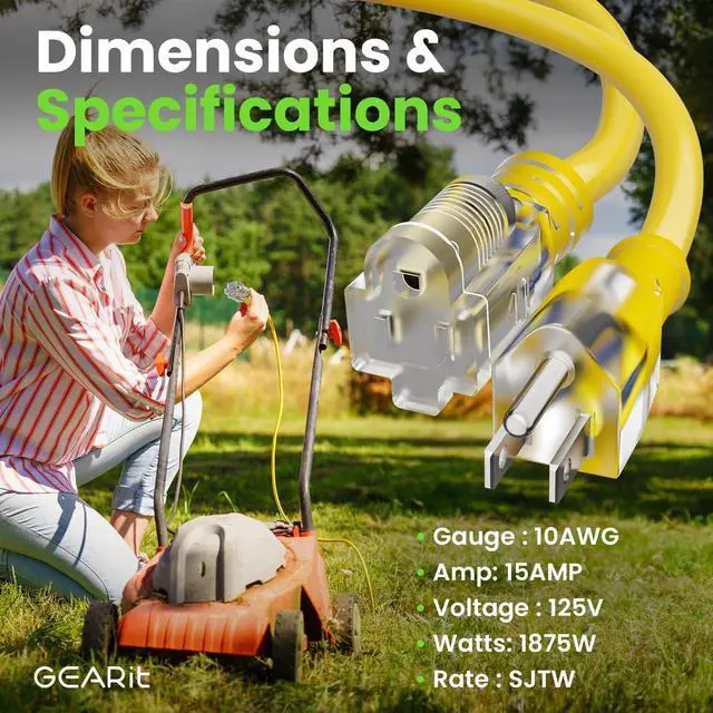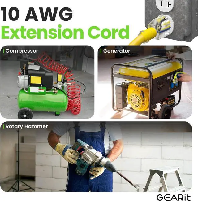 GEARit 10/3 Outdoor Extension Cord - Use this 100-foot outdoor extension cord with 3-prong connectors to reach power tools, gardening appliances, snow throwers and other power-hungry pieces of equipment wherever you need them, from front yards to professional construction sites, in all weather conditions thanks to the SJTW jacket design.