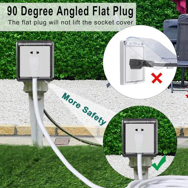 90-DEGREE FLAT PLUG When you use our products at home, the 90-degree bend allows you to plug into the back of the narrow sofa and TV cabinet, giving you more space possibilities. When you use it in the yard, the 90 degree plug will not lift the waterproof cover of your outlet. Ensure more secure use.