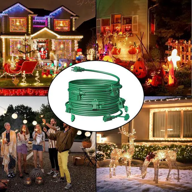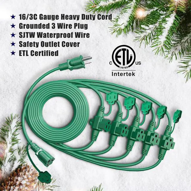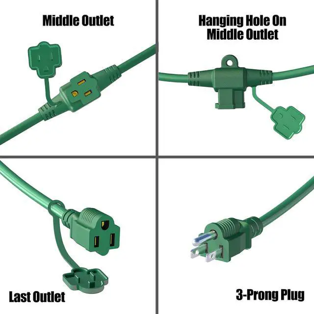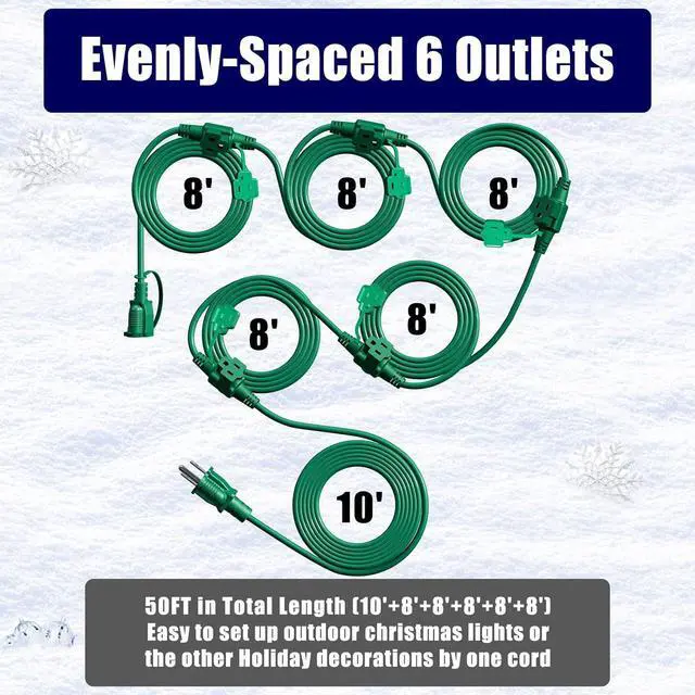 EVENLY SPACED 6 OUTLETS 50 feet total length; Outlets evenly-spaced apart from each plug (10' +8' +8' +8' +8' +8' ); Green extension cord with 6 spaced outlets allow you to plug in more device in 1 cable. Easy to set up landscape lighting, outdoor string lights, Christmas decoration and multiple electrical devices
