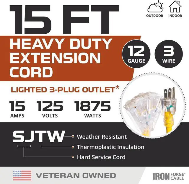 REINFORCED BLADES protect prongs from bending or breaking. 12 GAUGE HEAVY DUTY wire, 15 foot, 15 amp, 125 volt, 1875 watt, 5-15P/R, ETL/CETL Listed