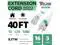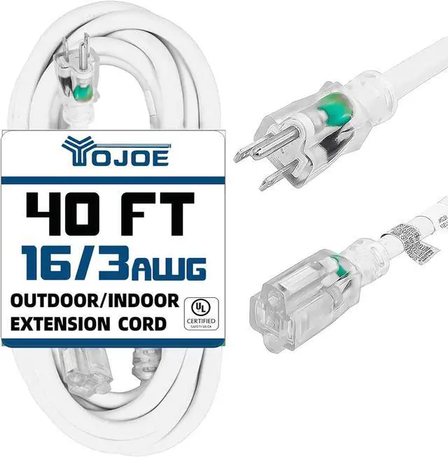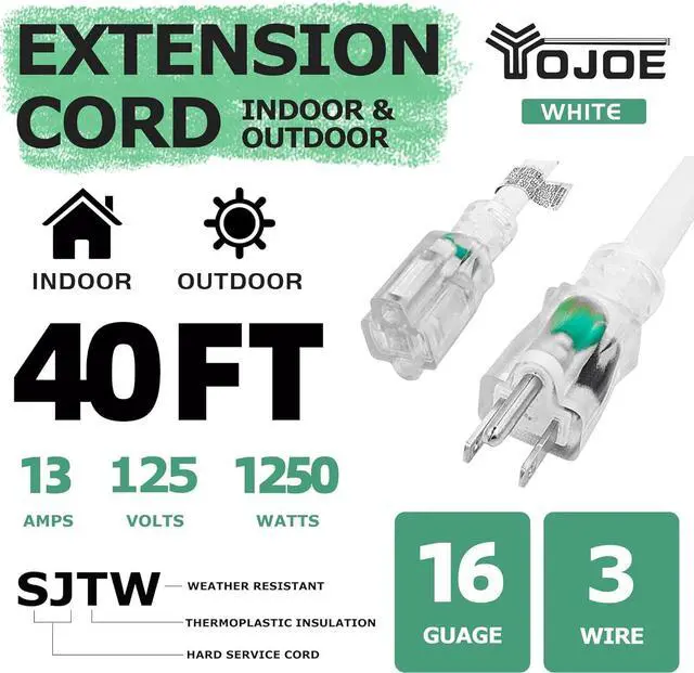 : This 40FT White extension cord features a lighted end that indicates when power is active. 16 gauge extension cord, 3-prong grounded plug, and supports 13 amps, 125 volts, and 1625 watts. It operates effectively within a Temperature Range of -40°F to +140°F.
