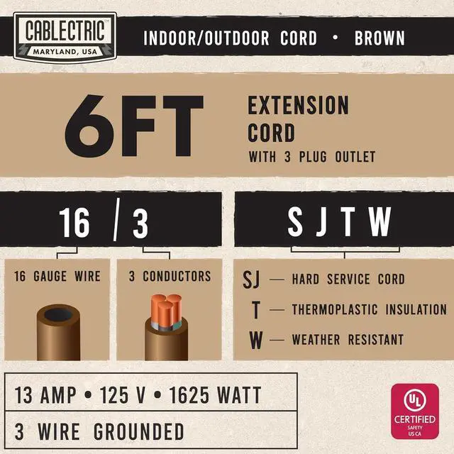 TOUGH & DURABLE NICKEL BLADES: The blades of this Cablectric' s 6 foot brown extension cord 3 plugs are nickel-coated and reinforced to improve both their durability & longevity. These contractor extension cords feature lessened cord strain, making them slip resistant. Solid ends also help to identify when the cord is powered.