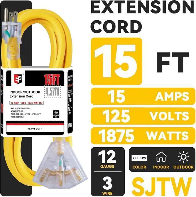 Heavy Duty Extension Cord - 12 AWG, 3 Pure Copper Conductors, 125V/15A/1875W, NEMA5-15P to NEMA5-15R, SJTW Jacket, emperature