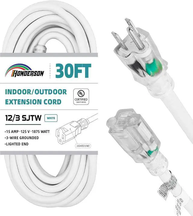 PERFORMANCE PARAMETER: White 30FT extension cord with Lighted End, 12gauge, 3 prong grounded plug, 15amp, 125volt, 1875watt.