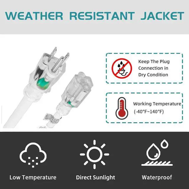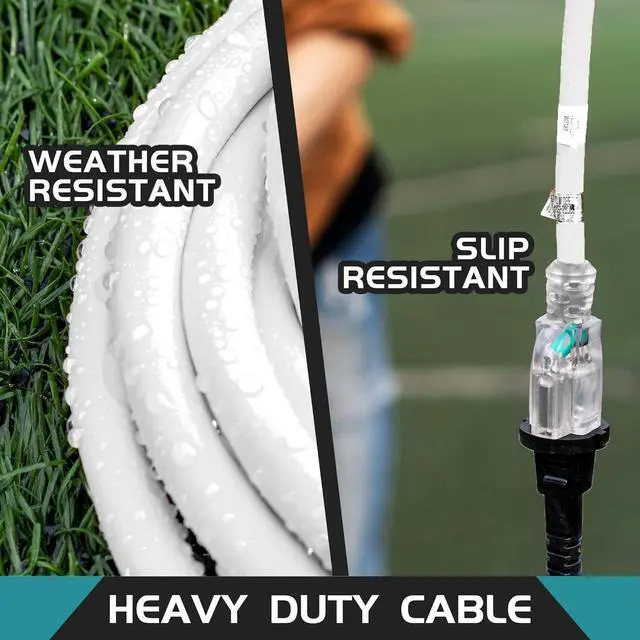 WIDE APPLICATION SCENARIOS: This SJTW extension cord has passed UL certification and meets the needs of high-power electrical equipment in outdoor various complex weather conditions, such as lawn mowers, chainsaws, Christmas lights, and other outdoor power tools used in gardens and garages. The Lighted end can prompt whether power is on to improve safety. It is also very suitable for indoor household appliances such as microwave ovens, electric heaters, and computers.