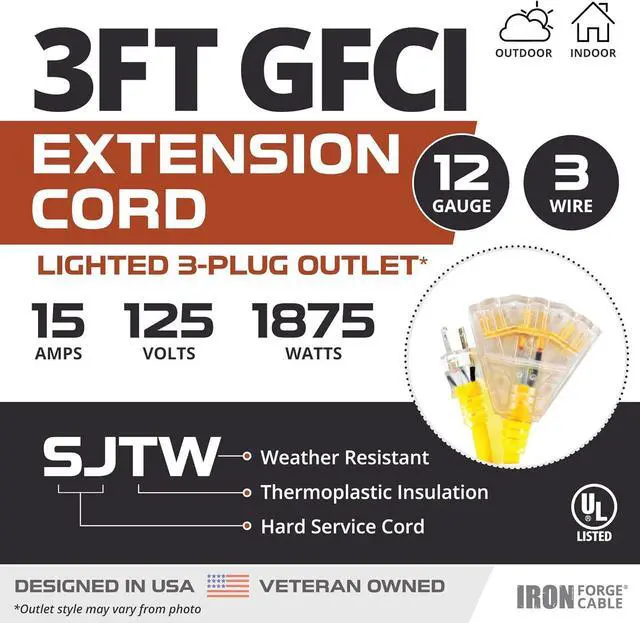 3 Outlet Extension Cord for Maximum Utility Features a 3 way plug adapter that transforms one outlet into three, allowing you to power multiple tools or appliances at once. This gfci power strip is perfect for simultaneous use in demanding environments.